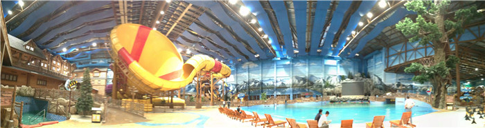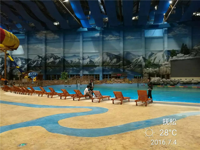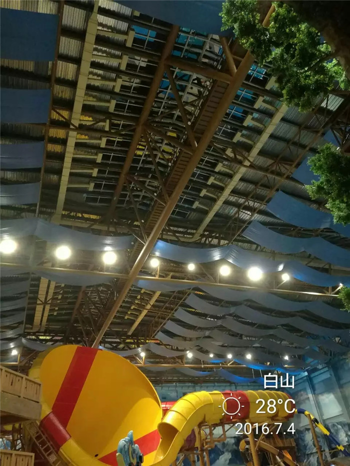 萬達(dá)長(zhǎng)白山水上樂園采用管桁架結(jié)構(gòu),總建筑面積25000㎡。單榀鋼梁260噸,跨度100m,屋面采用鋁鎂錳板及采光天窗。