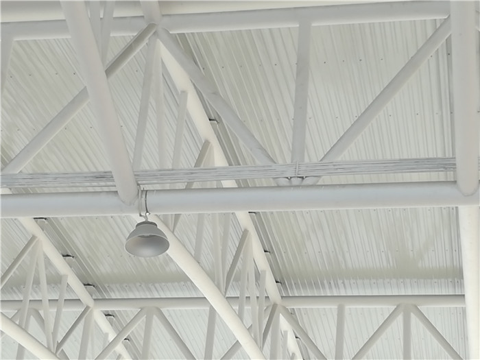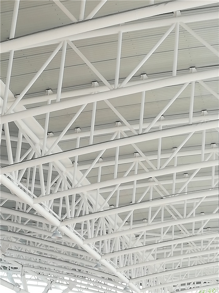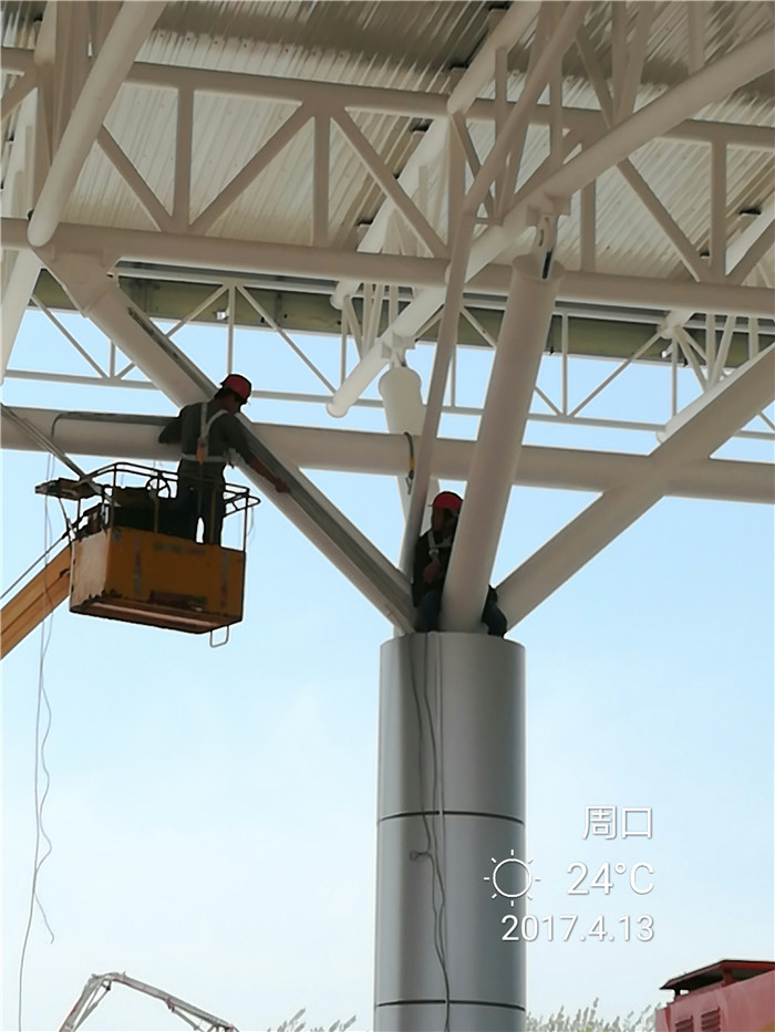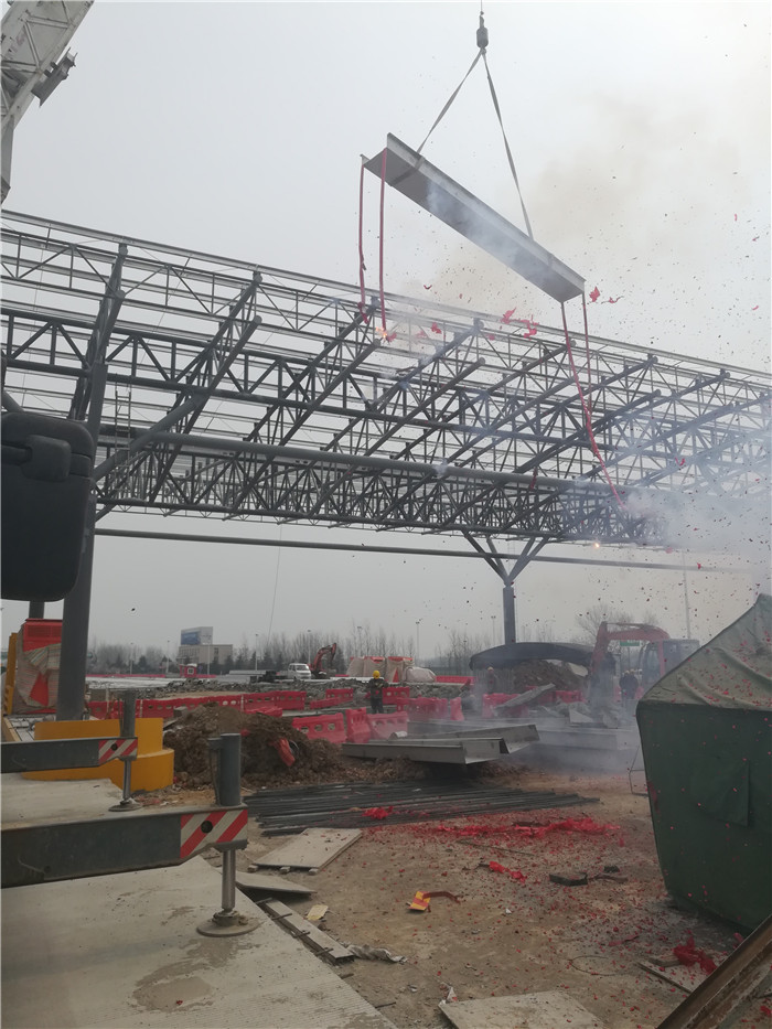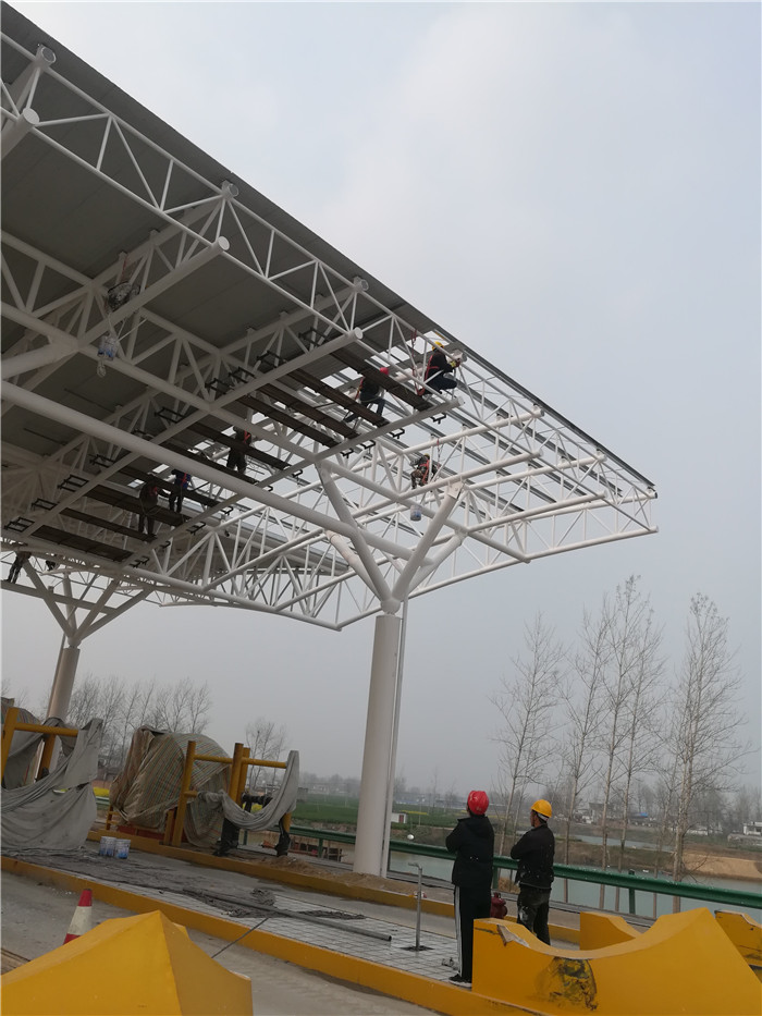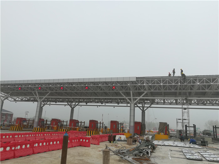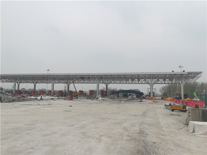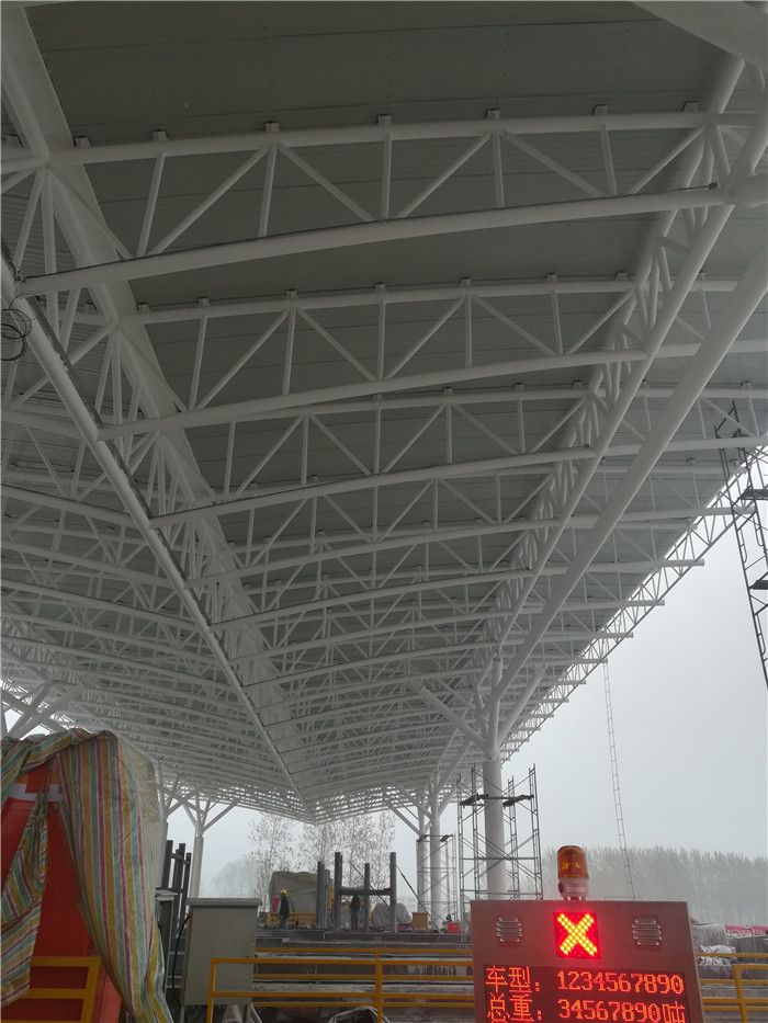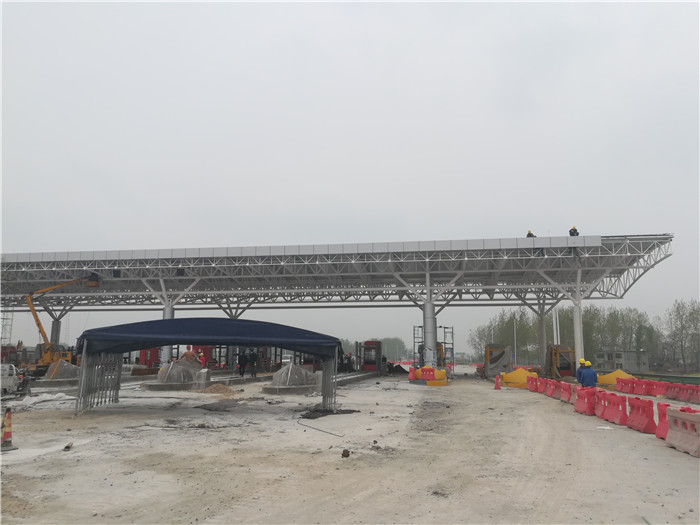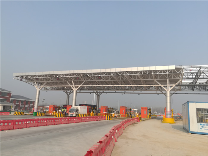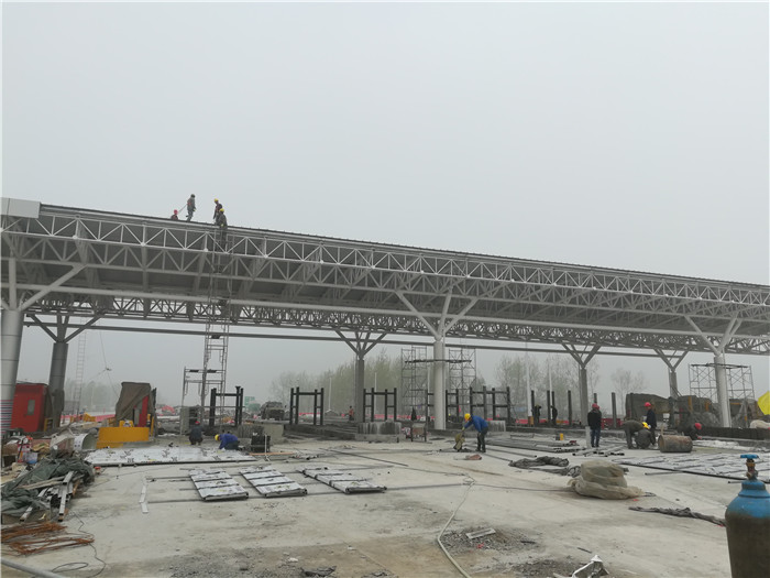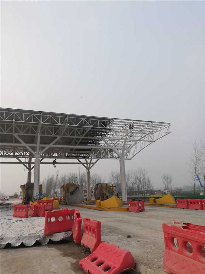周口收費(fèi)站采用桁架設(shè)計(jì),跨度為107.2米,長(zhǎng)24米,建筑面積2572.8平方米,材質(zhì)為Q235B。