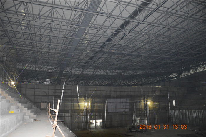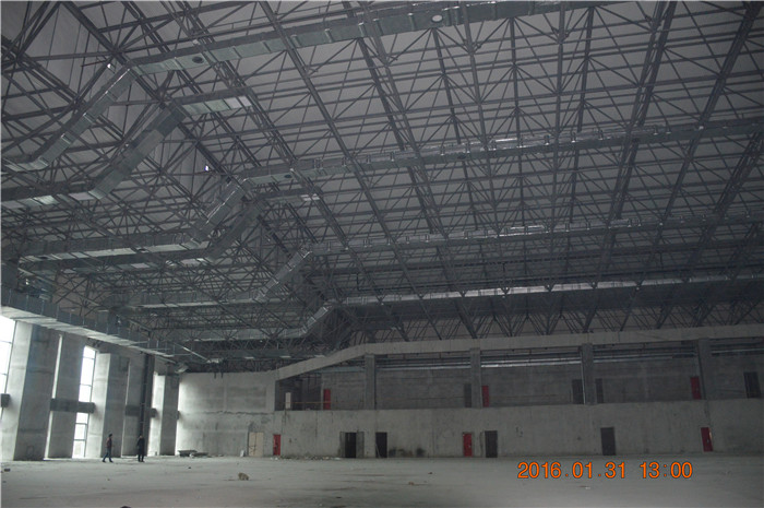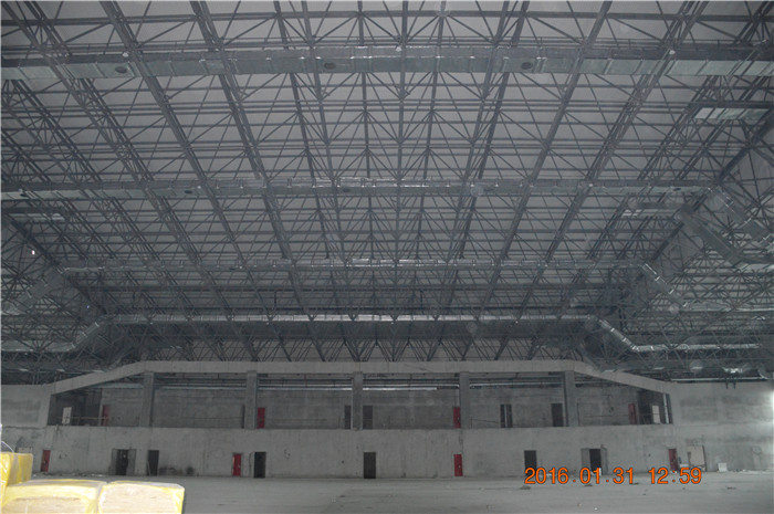 華西村活動(dòng)中心采用螺栓球網(wǎng)架設(shè)計(jì),跨度為72m,長120米。建筑面積8640㎡,材質(zhì)為Q235B,結(jié)構(gòu)類型為下弦柱腳支撐異型網(wǎng)架。